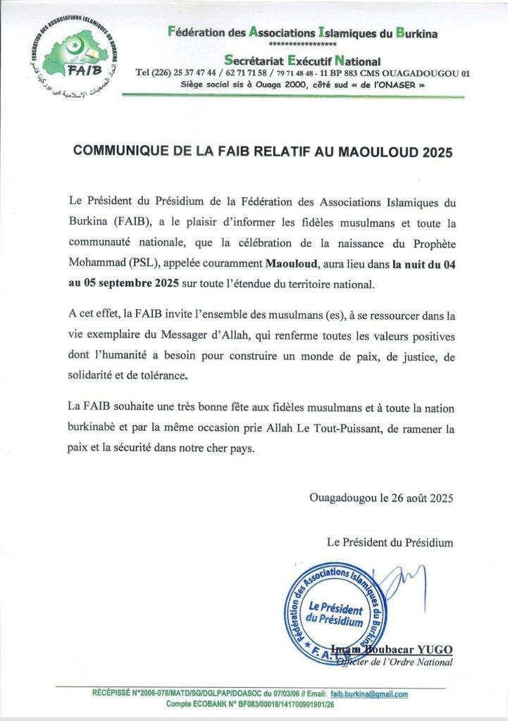 La Fédération des Associations Islamiques du Burkina (FAIB) a informé, à travers un communiqué, que la célébration de la naissance du Prophète Mohammad (PSL), appelée couramment Maouloud, se tiendra dans la nuit du 04 au 05 septembre 2025 sur toute l’étendue du territoire national.