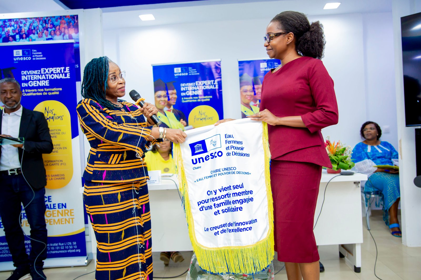 Labellisée « Think Tank » par l’UNESCO, la Chaire UNESCO « Eau, Femmes et Pouvoir de Décisions » (CUEFPOD) est une structure internationale de référence dédiée à la promotion du genre, de l’égalité des chances femmes-hommes, de l’eau et du développement durable, à travers la recherche, la formation, l’action communautaire et l’innovation sociale. Créée en 2006 et dirigée par Madame la Ministre Euphrasie Kouassi Yao, la CUEFPOD s’impose depuis bientôt 20 ans (2006-2026) comme un acteur majeur du changement social, en accompagnant la transformation des mentalités, des politiques publiques et des pratiques institutionnelles. Elle a conçu et mis en œuvre plusieurs programmes phares aujourd’hui reconnus au plan national et international, notamment : le Compendium des Compétences Féminines de Côte d’Ivoire (COCOFCI), le programme CREA-PAIX (Communautés Régionales pour l’Autonomisation et la Paix), la Formation en Ingénierie du Genre (FIG), le MASTER Genre, Économie et Gestion Durable, ainsi que le Label GECE (Genre et Compétitivité des Entreprises). À travers ces initiatives, la CUEFPOD forme et accompagne une nouvelle génération d’expert(e)s, capables d’intégrer une approche genre transformative dans les politiques publiques, les stratégies d’entreprises et les projets de développement. En partenariat avec des universités, des organismes internationaux, des gouvernements, le secteur privé et la société civile, la Chaire œuvre à faire de l’égalité des chances entre les femmes et les hommes, les filles et les garçons, le pilier d’un développement équitable, durable et pacifique.