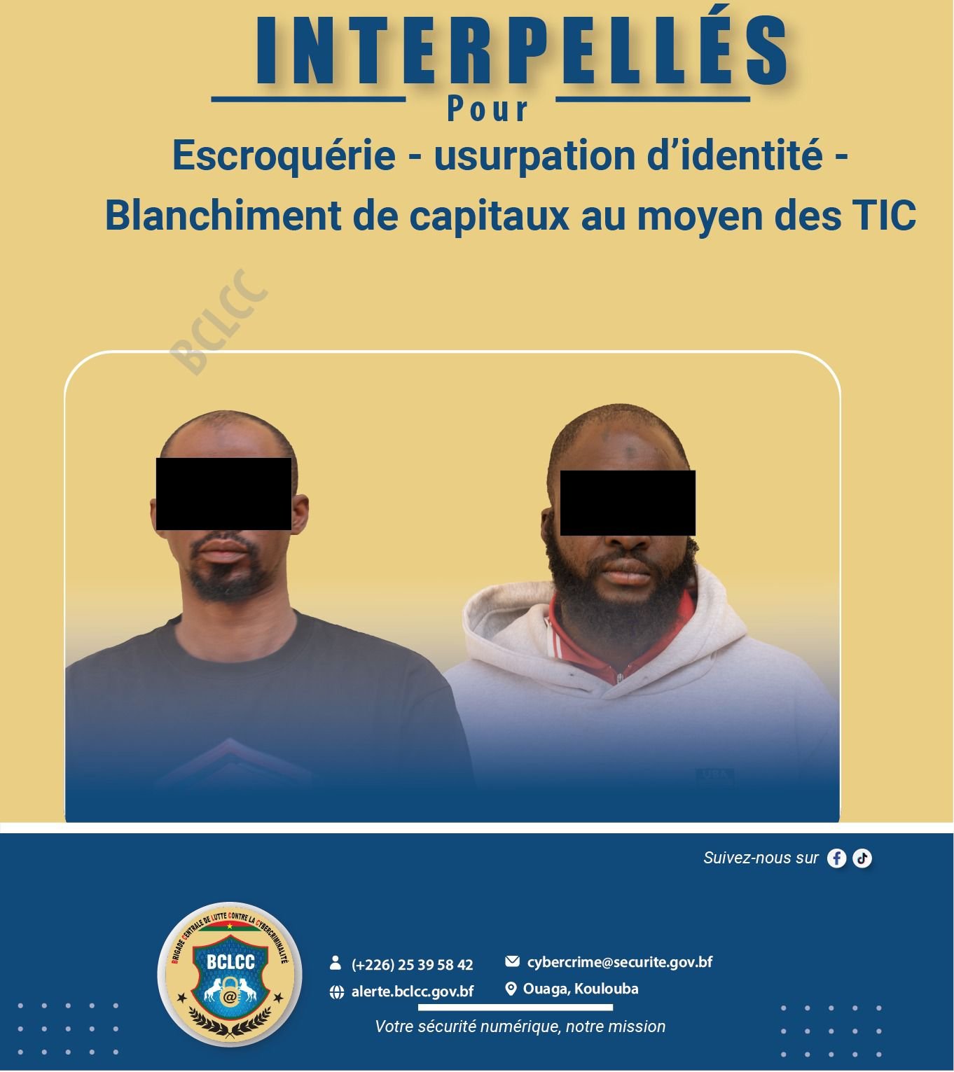 Dans le cadre de sa mission de protection des personnes et de leurs biens dans le cyberespace burkinabè, la Brigade Centrale de Lutte Contre la Cybercriminalité (BCLCC) a procédé à l’interpellation de deux individus impliqués dans des faits d’escroquerie, d’usurpation d’identité et de blanchiment de capitaux commis à l’aide des technologies de l’information et de la communication. L’une des personnes mises en cause dans cette affaire est connue des services de sécurité pour des faits similaires.
